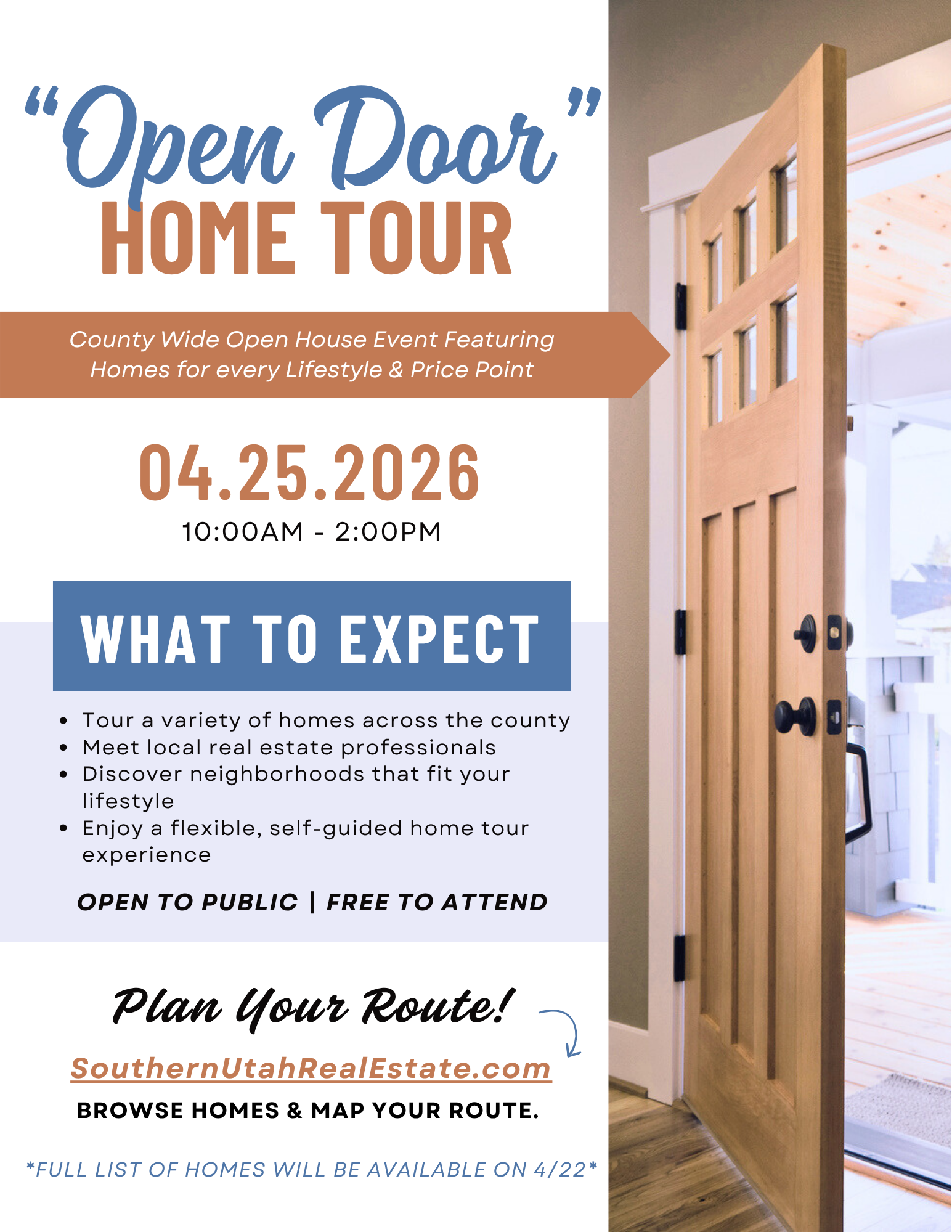 Introducing the Washington County Open Door Home Tour, a first-of-its-kind, county-wide open house event designed to connect our community with the homes, neighborhoods, and opportunities that make Southern Utah such a special place to live.
